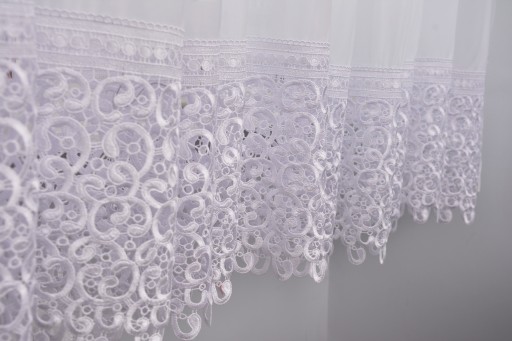 Oferujemy państwu firanę z białego woalu wykończoną gipiurą oraz lamówką, gotową do zawieszenia.