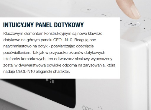 Oferując zachwycające, minimalistyczne wzornictwo, CEOL N10 stanowi połączenie prostych linii geometrycznych z najnowocześniejszą technologią. Centralnym punktem jest nowo opracowany, podświetlany, dotykowy panel kontrolny zdobiący górną część urządzenia. Pozwala on na intuicyjną oraz szybką kontrolę, bez zakłócania eleganckiego wykończenia. Jako nowość w tej serii, system CEOL jest teraz dostępny również w stylowym szarym wykończeniu, a także eleganckim białym i odważnym czarnym kolorze. Dodano również ulepszony wyświetlacz OLED.