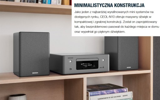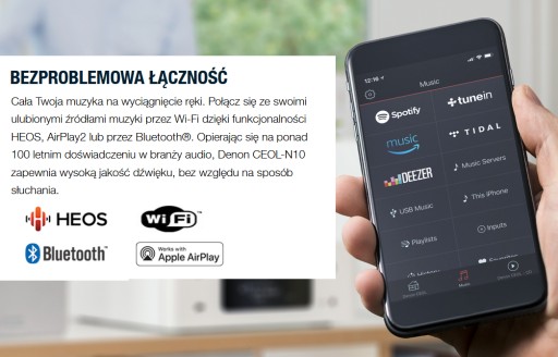 Dzięki Denon CEOL-N10 Twoje możliwości słuchania ulubionej muzyki są prawie nieograniczone. Odtwarzaj swoje płyty CD, streamuj listy odtwarzania za pośrednictwem Spotify, Deezer Premium lub Tidal oraz ciesz się trybem multi room dzięki pomocy wbudowanej technologii HEOS, używając Bluetooth® lub swojej sieci domowej. Korzystaj z radia internetowego oraz AirPlay2. A co najwygodniejsze: łatwo kontroluj swój system Mini HiFi za pomocą pilota, telefonu lub poleceń głosowych dzięki kompatybilności z Amazon Alexa. To tysiąc możliwości. To jest super, to CEOL.