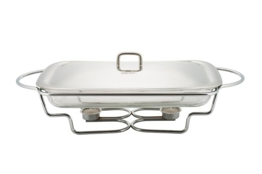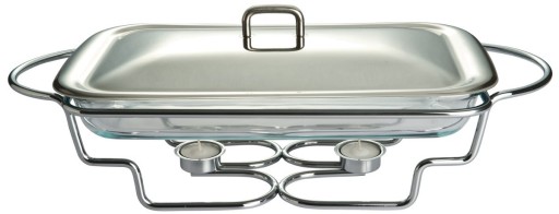 Szklany podgrzewacz do potraw. Pokrywa z wysokiej jakości stali nierdzewnej. Szklany wkład w metalowej podstawie. Dwie świece podgrzewające żywność. Nadaje się do zmywania w zmywarkach. Szklany wkład można używać w mikrofalówkach.