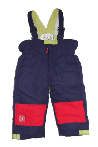 Poliestrowe spodnie, ocieplane, na regulowanych szelkach, w pasie lekka gumeczka, u dołu nogawek pasy śnieżne- używane stan bardzo dobry.