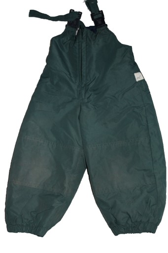 Nylonowe lekko ocieplane spodnie, na regulowanych szelkach, z tyłu w pasie gumeczka, u dołu nogawek gumeczka- używane stan dobry- lekko wytarta pupa i kolanka.
