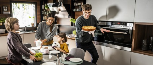 Doskonałe wypieki to nie tylko kwestia umiejętności, ale przede wszystkim odpowiedniego piekarnika. Z BakingPro System™ możesz już zapomnieć o nierównomiernie wypieczonym cieście czy o zbyt suchym mięsie! A to wszystko dzięki precyzyjnie zaprojektowanej dystrybucji ciepła oraz stabilnej temperaturze wewnątrz komory piekarnika, które gwarantują, że Twoje ciasta już nigdy nie będą niedopieczone w środku ani przypalone po bokach. Nawet fragmenty przy szybie dopieką się perfekcyjnie dzięki zastosowaniu większych grzałek i wysunięciu ich do przodu. Komora jest ponadto większa i ma więcej poziomów pieczenia teraz możesz upiec przysłowiowe kilka pieczeni na jednym ogniu! Większe są też blachy, a nowa osłona wentylatora przyspiesza nagrzewanie do 150°C w zaledwie 3 minuty! Nowe oświetlenie na górnej ścianie zapewnia znacznie lepszą widoczność wypieków niż dotychczas. Najnowsze technologie w nowym kształcie dla jakości pieczenia, jakiej jeszcze nie było! Na co dzień w Twojej kuchni! Goście się spóźniają, a potrawa stygnie Teraz, dzięki ciepłu utrzymującemu się w piekarniku po zakończeniu pieczenia, możesz ją przechować, spokojnie czekając na spóźnialskich. O stopniu nagrzania komory poinformuje Cię elegancki Podświetlany uchwyt włączy się podczas pieczenia, a wyłączy dopiero po jego zakończeniu, kiedy temperatura spadnie poniżej 40⁰C. Dodatkowo pozwoli Ci to uniknąć poparzenia. Bezpiecznie, elegancko i ze smakiem. Oszczędzasz czas - piekarnik osiąga 150°C w zaledwie 3 minuty! Dla zabieganych czy po prostu głodnych.
