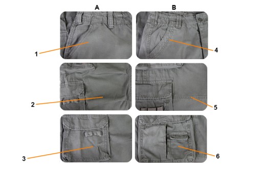 - posiadają 6 kieszeni, 2 z przodu, 2 z tyłu, 2 kieszenie transportowe na udach typ CARGO. Spodnie oraz kieszenie zapinane są na guziki