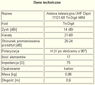 DIPOL 17 Tri-Digit MINI jest anteną kierunkową, przystosowaną do odbioru naziemnej telewizji cyfrowej DVB-T. Zysk anteny wynoszący 14dBi pozwoli na odbiór sygnału z nawet bardziej oddalonych nadajników telewizyjnych.