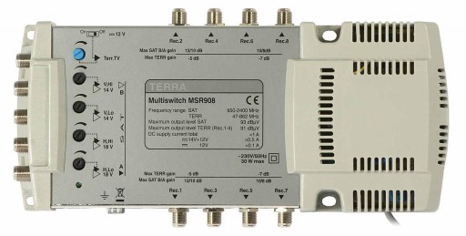 Urządzenie znanej firmy Terra, która specjalizuje się w produkcji profesjonalnych multiswitchy, dla potrzeb instalacji zbiorowych. Znakomite wykonanie, stabilność parametrów, bardzo niska awaryjność, sprawiają że multiswitche Terry można polecić nawet najbardziej wybrednemu klientowi. Multiswitch współpracuje ze wszystkimi platformami Cyfrowymi (POLSAT, CYFRA+, N)