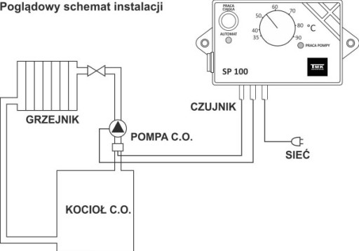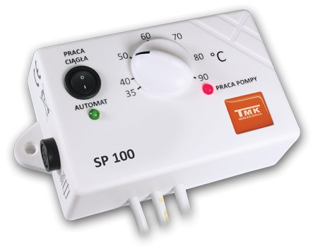 Sterownik SP 100 firmy TMK to prosty w obsłudze sterownik przeznaczony do automatycznego załączania i wyłączania pompy obiegowej c.o. z silnikiem 230V 50Hz o mocy 100VA.