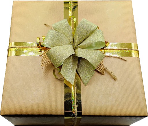 WZÓR 2 - pudełko z kosmetykami owinięte estetycznym papierem przyozdobione jest efektowną złotą wstęgą z piękną kokardą, mieniącą się wstążką, naturalnym sznurkiem oraz ozdobnym materiałem.