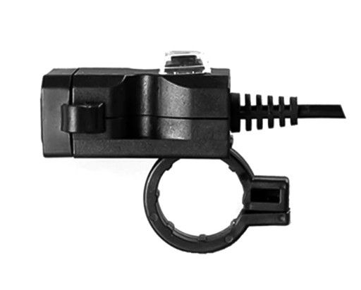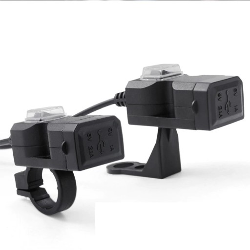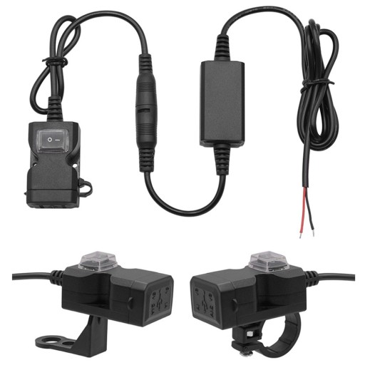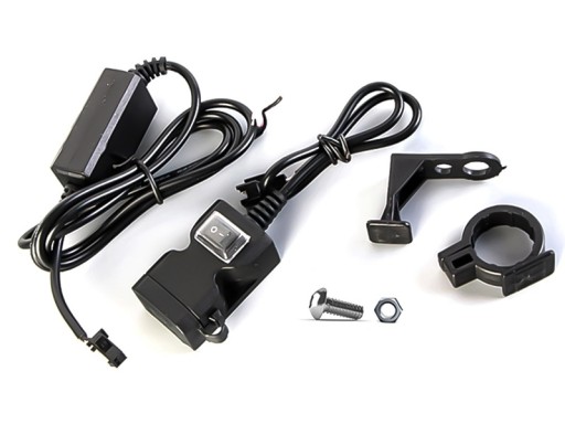 Gniazdo posiada włącznik ON/OFF i kabel o długości ok. 150cm do podłączenia do akumulatora. Dzięki dwóm uchwytom w zestawie możemy zamontować uchwyt na kierownicy, pod lusterko lub do jakiejkolwiek śruby na kierownicy max 10mm. Ładowarka została zaprojektowana do działania w niesprzyjających warunkach atmosferycznych i jest wyposażona w osłonę gniazd zabezpieczające przed wodą.