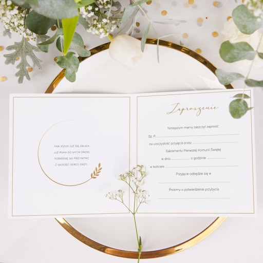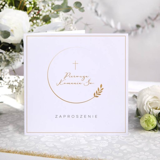 - zaproszenia wykonane są w odcieniach bieli i matowego złota, dekorowane nadrukiem wianuszka zakończonego gałązką i delikatnym krzyżykiem