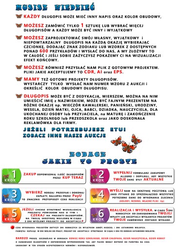 NAPISY wykonane są metodą LASEROWEGO GRAWEROWANIA czyli usunięcia poprzez delikatne i bardzo precyzyjne wypalenie wierzchniej warstwy lakieru, co umożliwia odwzorowanie nawet niewielkich detali. Taki grawer podczas zwykłego użytkowania długopisu jest NIEŚCIERALNY w przeciwieństwie do napisów drukowanych, co pozwala korzystać z niego przez bardzo długi czas.