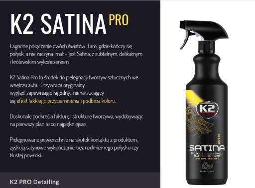 K2 SATINA PRO to środek do pielęgnacji tworzyw sztucznych we wnętrzu auta. Przywraca oryginalny wygląd, zapewniając łagodny, nienarzucający się efekt lekkiego przyciemnienia i podbicia koloru. Doskonale podkreśla fakturę i strukturę tworzywa, wydobywając na pierwszy plan to co najpiękniejsze.