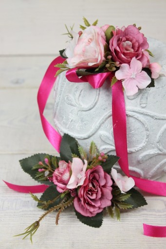 Wykonany z kwiatów róży i hortensji w kolorze jasnego, ciemnego różu i kremu, zdobiony gałązkami bluszczu, ozdobnej trawy i perełkami.
