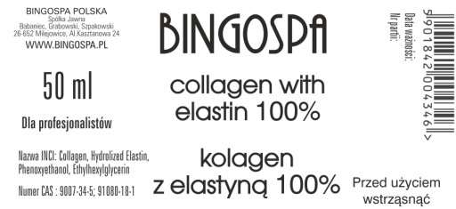 Kolagen z elastyną BINGOSPA dzięki swojej kompatybilności z rozpuszczalnikami lipidowymi i wodnymi, łatwo przenikają do skóry wpływając na jej uelastycznienie i wygładzenie zmarszczek oraz przyczyniają się do poprawy witalności skóry. Korzystne i celowe jest stosowanie do pielęgnacji skóry połączenia elastyny z kolagenem BINGOSPA w celu dodatkowego zapewnienia skórze właściwego jej nawilżenia i utrzymania stałej równowagi wodno-tłuszczowej.