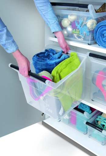 W domu pełnym przedmiotów wymagających specjalnego traktowania niełatwo okiełznać nieuporządkowaną, a tak cenną przestrzeń. Odpowiednie przechowywanie zapewnia naszym rzeczom trwałość i bezpieczeństwo, jednoczesnie redukując bałagan. Pojemniki wielofunkcyjne NUK pozwolą na perfekcyjną segregację przedmiotów niezbędnych w domu - od kuchni po garaż. Nasz inteligentny i efektywny system przechowywania "na miarę" wprowadza dyscyplinę w utrzymaniu codziennego porządku w pralni, garderobie, kuchni, łazience czy dziecięcym pokoju. Klarowna organizacja przestrzeni warsztatowej również przynosi korzystne efekty - funkcjonalne i wygodne miejsce pracy to komfort i ułatwiony dostęp do narzędzi. Pojemniki NUK służą jako schowek na drobiazgi, akcesoria szkolne i biurowe, nierzadko ogromną ilość zabawek i dziecięcych bibelotów. W kuchennej szafce pod zlewem taki system wewnętrznej organizacji zapewni szybki i łatwy dostęp do chemikaliów, zapobiega rozlaniu się płynnych substancji, środków do dezynfekcji, detergentów. Dostępne w uniwersalnych rozmiarach z powodzeniem zastępują szuflady i pasują do standardowych systemów meblowych dostępnych na rynku. Małe pojemniki NUK na przyprawy mogą jednocześnie pełnić rolę wkładów do szuflad, a głębokie doskonale sprawdzą się jako domowa spiżarnia. Ich największą zaletą jest poręczność, pojemność i możliwość szybkiego przenoszenia z miejsca na miejsce. Wykonane są z elastycznego transparentnego tworzywa, ułatwiajacego zlokalizowanie przedmiotów znajdujących się wewnątrz. Kółka prowadzące oraz rączka zapewniają mobilność i łatwe przesuwanie w komorze szafki. Nóżki pełnią rolę hamulca. Gładkie powierzchnie ułatwiają czyszczenie.