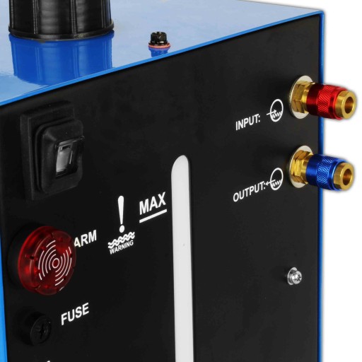 Urządzenie wyposażone jest w czujnik przepływu cieczy chłodzącej. W razie braku lub zbyt niskiego przepływu cieczy rozlegnie się alarm dźwiękowy oraz zacznie migać dioda ALARM na panelu czołowym. W takim przypadku należy niezwłocznie przerwać pracę i usunąć przyczynę alarmu.