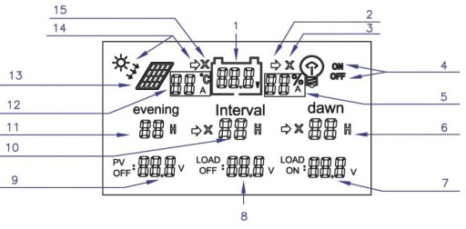 Możliwości czasowego ustawienia włączenia na określony czas po zmroku od 1h do 23h, lub ręcznego sterowania wyjściem obciążenia, aż do ustawionego minimalnego napięcia na akumulatorach.