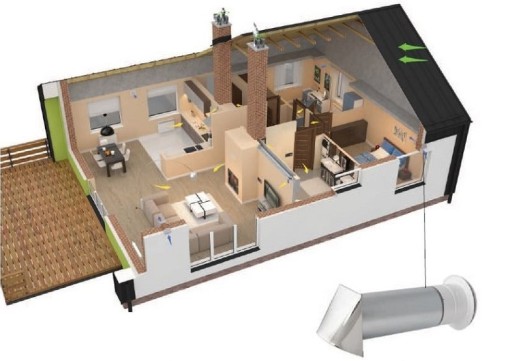 Świeże powietrze zewnętrzne doprowadzone jest przez nawietrzaki zamontowane w pokoju dziennym lub sypialni. Zasysane powietrze przepływa przez kolejne pomieszczenia i usuwane jest przez kratkę wentylacyjną zamontowaną najczęściej w kuchni lub łazience.