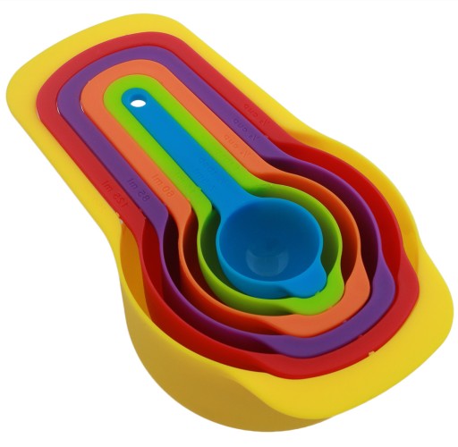 Niezwykle praktyczny zestaw plastikowych łyżeczek do odmierzania materiałów sypkich i płynnych.