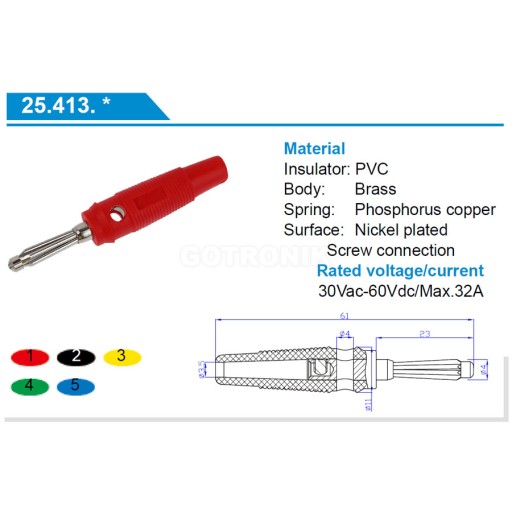 Wtyk bananowy 4mm prosty produkcji Amass. Przewód elektryczny należy przykręcić do wtyku bananowego (bez konieczności lutowania). Oferowane wtyki bananowe 4mm idealnie nadają się do samodzielnego wykonywania przewodów pomiarowych i laboratoryjnych o dowolnej długości.