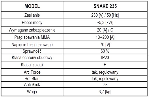 Urządzenie SNAKE 235 jest spawarką przeznaczoną do ręcznego, elektrycznego spawania stali i innych spawalnych metali i stopów metodą MMA.