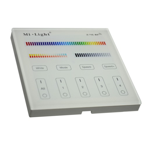 pilota panelowego radiowego MiLight B4 , 4-strefowego, przeznaczonego do sterowania sterownikami strefowymi MiLight RGB FUT037 lub RGBWW FUT039 lub mono FUT036 lub CCT FUT035 . Pilot pozwala na stworzenie od jednej do 4 stref oświetlenia LED . Pilot zasilany jest bateryjnie (dwie baterie AAA - w zestawie nie ma baterii).. Pilot może być używany niezależnie lub równocześnie z pilotem "do ręki" MiLight RGB+CCT FUT092. Przed pierwszym użyciem należy sparować pilota ze sterownikami zgodnie z instrukcją. Do jednej strefy można przypisać nieograniczoną ilość sterowników.