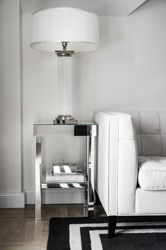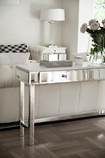 Stolik nocny lustrzany z szufladą i półką konsekwentnie i z dyscypliną zachowuje tę samą formę i kształt, jak komoda i regał z szufladami, aby można było wszystko spójnie zaaranżować we wnętrzu, nie obawiając się przy tym efektu chaosu. Stolik nocny z lustra kryształowego z szufladą z KOLEKCJI GREENWICH o prostej, starannie wykonanej, pełnej formie, ozdobiona jedynie gałką kryształową w formie uchwytu rozbudowała ofertę firmy AS HOME o dział mebli przeznaczonych do przechowywania. KOLEKCJA GREENWICH tworzy mebel użytkowy i funkcjonalny, który jednocześnie nie traci swoich walorów estetycznych.