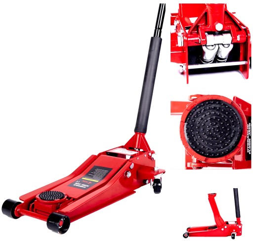 Podnośnik niskoproofilowy typu żaba 4T. Podnośniki zostały wyposażone w mocny 2 stopniowy siłownik ( 2 tłoki), oraz 4 mocne , szerokie koła - tylne koła skrętne