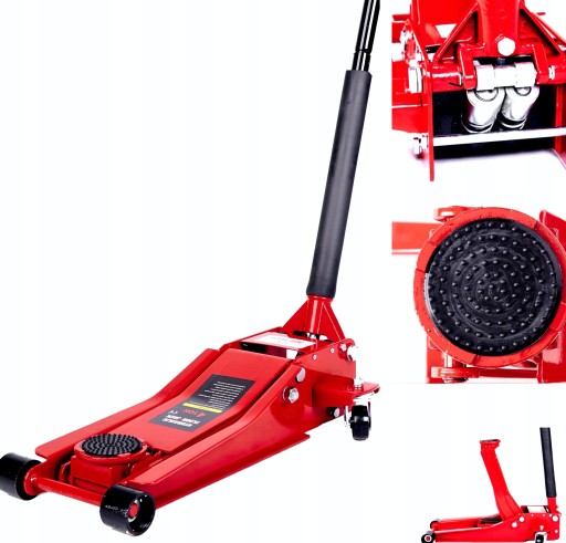 Podnośnik niskoproofilowy typu żaba 4T. Podnośniki zostały wyposażone w mocny 2 stopniowy siłownik ( 2 tłoki), oraz 4 mocne , szerokie koła - tylne koła skrętne