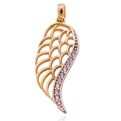 Delikatna, subtelna zawieszka ażurowa w kształcie skrzydła anioła wykonana z dwukolorowego złota próby 333 to idealna ozdoba, której blasku dodają zdobiące ją białe cyrkonie. Nasycona energią, dobrocią, miłością i anielską opieką będzie idealna zarówno dla Ciebie, jak i dla osoby, którą zechcesz nią obdarować. Wysoka precyzja wykonania, dbałość o każdy szczegół sprawi, że zawieszka będzie cieszyć swoim pięknem długie lata.
