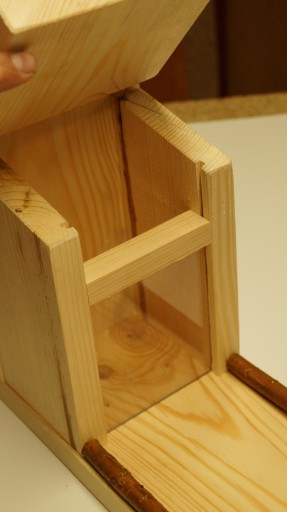 - gałązki na tarasie blokują spadanie wyciąganego pokarmu na ziemie a niewielkie szczeliny pod nimi usuwają deszczowa wodę ( szczelna obudowa tarasu powoduje tworzenie się tafli wody która niszczy karmnik oraz może się przedostawać do pożywienia )