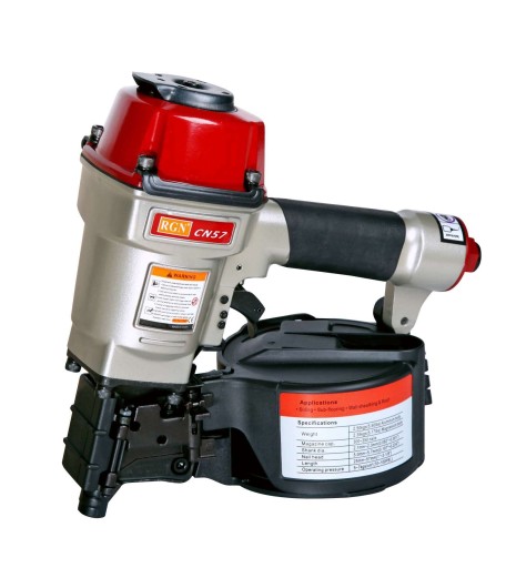 Gwoździarka bębnowa RGN CN55 na gwoździe łączone drutem pod kątem 16°, o długości 32 - 57 mm.Znajduje zastosowanie wszędzie tam, gdzie zachodzi potrzeba szybkiego wbijania gwoździ. Sprawdza się w budownictwie, dekarstwie i produkcji opakowań drewnianych czy palet.