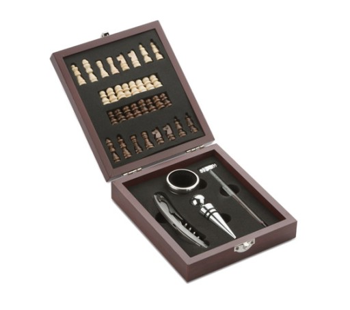 Piękny, czteroczęściowy zestaw do wina zawierający nóż kelnerski, termometr, zatyczkę oraz pierścień na butelkę. Dodatkowo posiada komplet szachów. Planszę do gry tworzy się poprzez rozłożenie drewnianego pudełka. Szachy wykonane są z drewna.