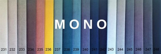 Tkanina Mono ( tkanina meblowa typu velvet z powłoką hydrofobową, miękka i przyjemna w dotyku ,wykazuje dobrą odporność na mechacenie i pilingi ,bardzo wytrzymała )