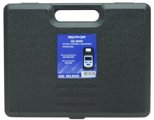 Tester AD-8000 pozwala na sprawdzenie stanu naładowania i wyeksploatowania akumulatorów 6/12/24V.Urządzenie wyposażone w drukarkę termiczną pozwalającą na wydruk wszystkich uzyskanych w badaniu wyników. W zestawie z urządzeniem znajduje się zapasowa rolka papieru termicznego.Oprócz testów akumulatora urządzenie pozwala także na sprawdzenie pracy rozrusznika oraz alternatora w pojeździe z instalacją 12 i 24V. Oraz wewnętrzny opór akumulatora – IR.AD-8000 jest umieszczony w walizce z tworzywa idealnej do przechowywania i przenoszenia.