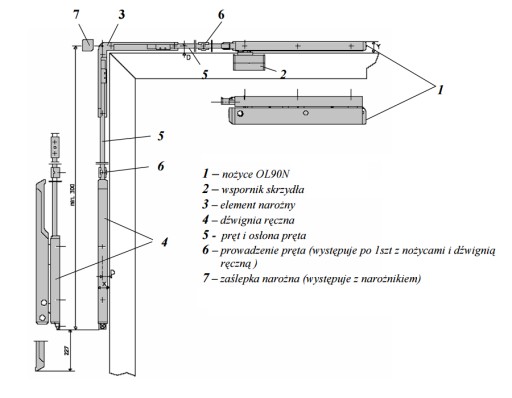 Za pomocą dźwigni popychamy pręt połączony poprzez narożnik z nożycami, skutkiem działania jest otwarcie nożyc i wychylenie okna. Okucie do zastosowania w skrzydle okiennym o max szerokości 1200mm/max waga skrzydła 80kg.