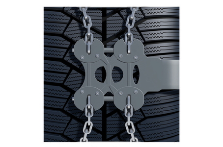 - Łańcuch na bieżnik koła złożony ze specjalnych paneli jezdnych z tworzywa z twardymi, stalowymi kołkami i łańcucha ze stali stopowej.