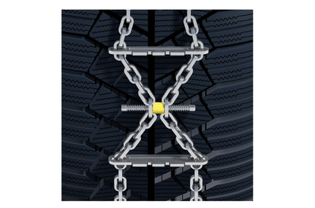 - Sprężyny napinające ograniczają dynamiczne unoszenie się łańcucha ponad powierzchnię opony i umożliwiają idealny montaż na kołach o różnych rozmiarach.