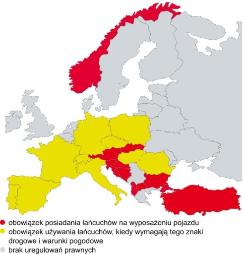 - Łańcuch na bieżnik koła złożony ze specjalnych paneli jezdnych z tworzywa z twardymi, stalowymi kołkami i łańcucha ze stali stopowej.