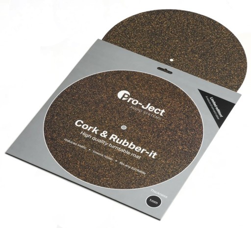 Maty wykonane z filcu mają słabe właściwości antystatyczne i przyciągają kurz, który przenosi się na płytę. Z drugiej strony, grube, gumowe maty aż nazbyt izolują płytę od talerza. Jak sama nazwa wskazuje, Cork & Rubber (korek i guma) wykorzystuje połączenie dwóch materiałów. Guma zapewnia kontrolę akustyczną, korek natomiast utrzymuje właściwości antystatyczne. Mata Cork & Rubber It o średnicy 30cm występuję w dwóch grubościach 1mm oraz 3mm.