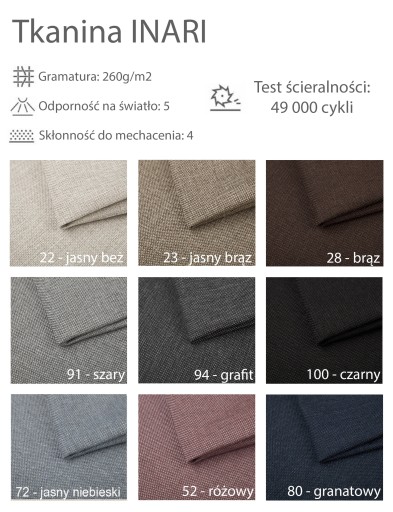 Bardzo dobrej jakości, wytrzymałe tkaniny odporne na uszkodzenia oraz ścieranie.