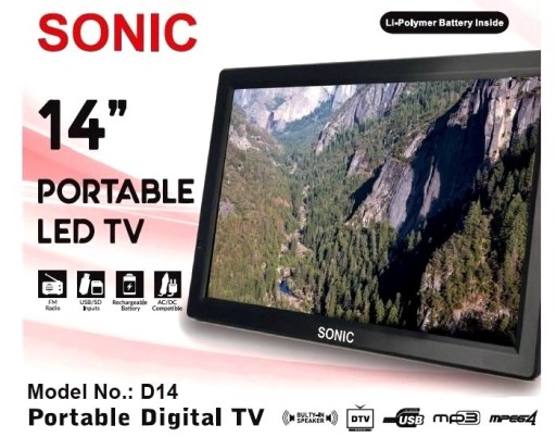 14 calowy przenośny telewizorek z obsługą telewizji cyfrowej DVB-T MPEG4.Telewizor posiada regulowaną nóżkę wbudowane głośniki pilot zdalnego sterowania oraz zasilacz sieciowy a także kabel AV do podłączenia zewnętrznych urządzeń.Posiada w zestawie antenę oraz możliwość podłączenia anteny zewnętrznej masztowej lub tym podobnej dowolnej pod okrągłe standardowe wejście antenowe