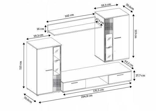 Szerokość meblościanki po ustawieniu elementów tak jak na rysunku poniżej to 234,8 cm. Czy to nie perfekcyjne dobrany wymiar.