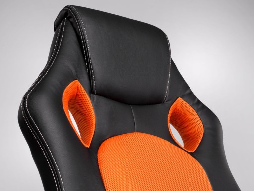 Ergonomiczny fotel z wysokim oparciem. Dostępny w kolorze czarnym z pomarańczowym akcentem.