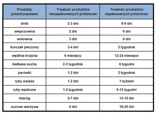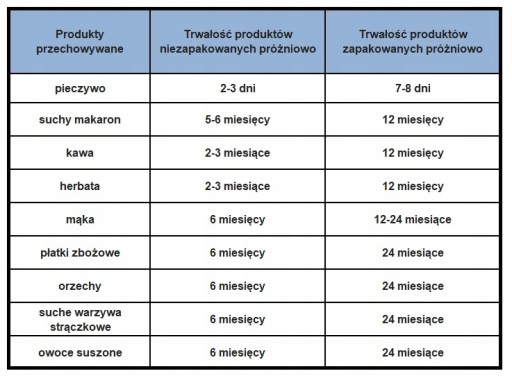 Zapakowane próżniowo produkty wilgotne (wędlina, mięso) nie wysychają, sypkie takie jak cukier nie skawalają się, a kawa nie traci aromatu (podobnie jak inne aromatyczne artykuły). Ponadto nie wchłaniają zapachów z innych produktów, które przechowujemy w lodówce.