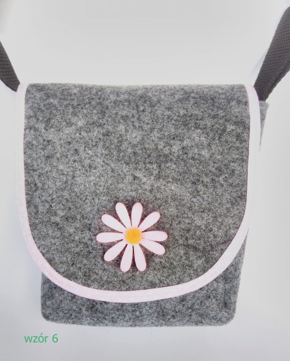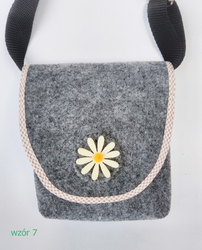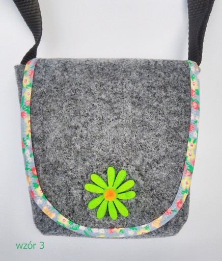 Torebka jest uszyta z filcu. Patka jest obszyta kolorową lamówką i ozdobiona filcowym kwiatkiem lub konikiem.