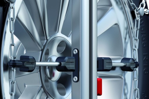 - Umieszczona w środku aluminiowa belka jest sercem automatycznego systemu napinającego. Wystarczy otworzyć wbudowany pedał i nacisnąć go stopą w dół, aby uruchomić system samonapinający. Łańcuch automatycznie napnie się wokół opony, gdy tylko samochód ruszy z miejsca.