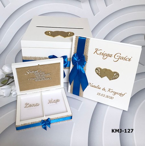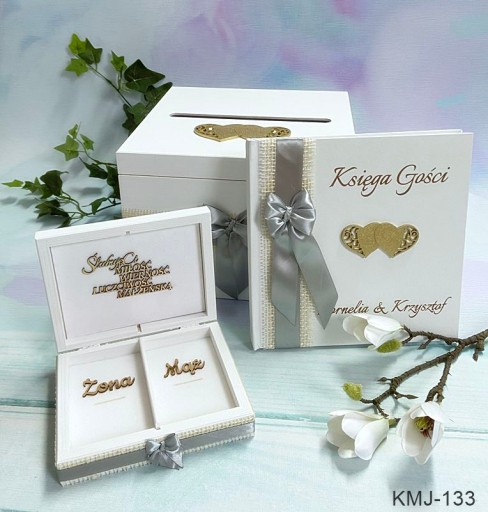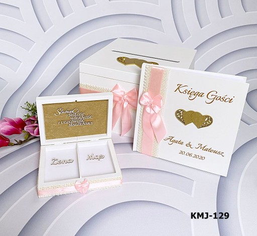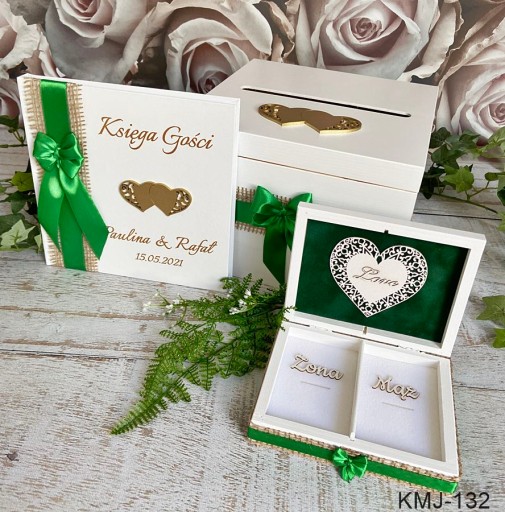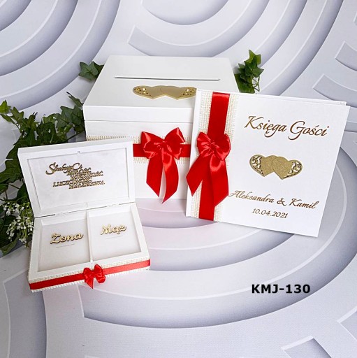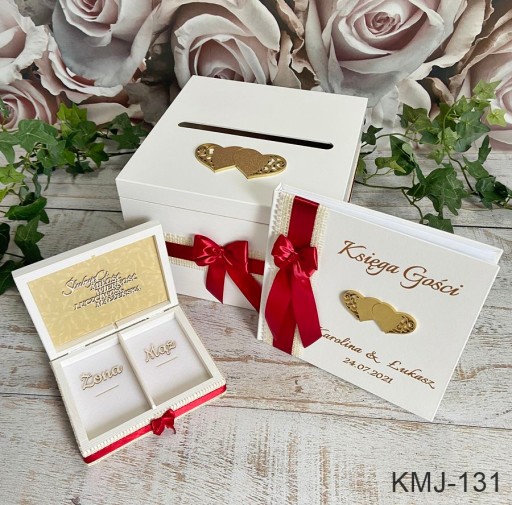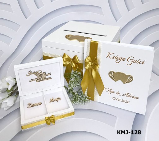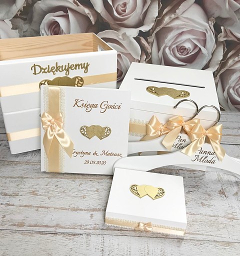 Na zewnątrz pudełka naklejony przestrzenny połączonych serc dekor lakierowany w kolorze złotym , jutowa szarfa i wstążka w wybranym kolorze