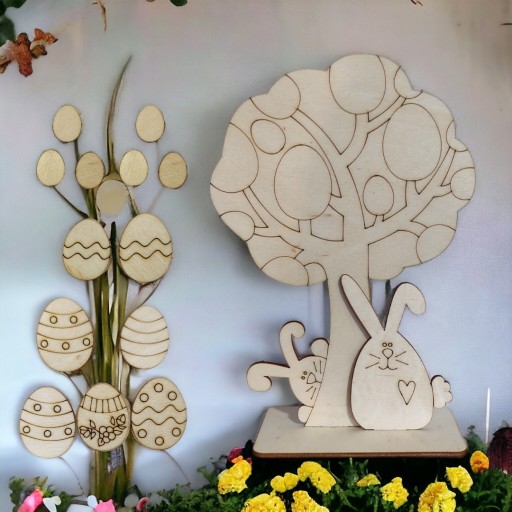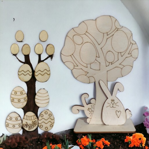 - Drzewko jest umieszczone na podstawce, dodatkowo posiada zajączki oraz pisanki, które po ozdobieniu dowolną techniką (kredki, farby) można nakleić na drzewko co powoduje że ozdoba jest przestrzenna. Ucieszy każde dziecko.