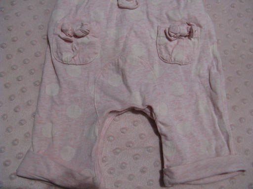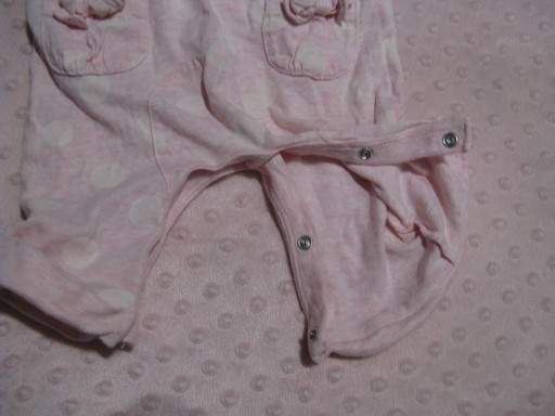 Śliczny rampers,różowy w białe grochy na szeleczkach zapinanych na guziki,długie nogawki podwijane z kieszonkami,boki i dół zapinany na zatrzaski,odbiór w punkcie tylko poczta